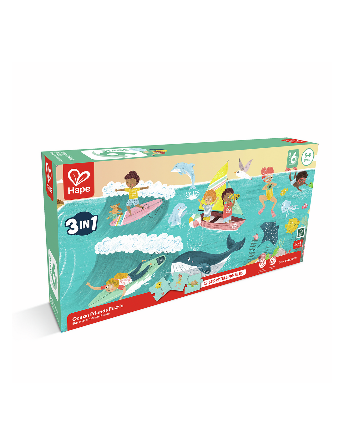 ¡Nada mejor que el sol, el mar y la arena! Con este puzle multi-pack puedes unir las piezas de una soleada imagen en la playa. Compuesto por 3 puzles separados, puedes montar tu propia historia frente al mar. También hay fichas de cuento para disfrutar de historias con infinitas variaciones.