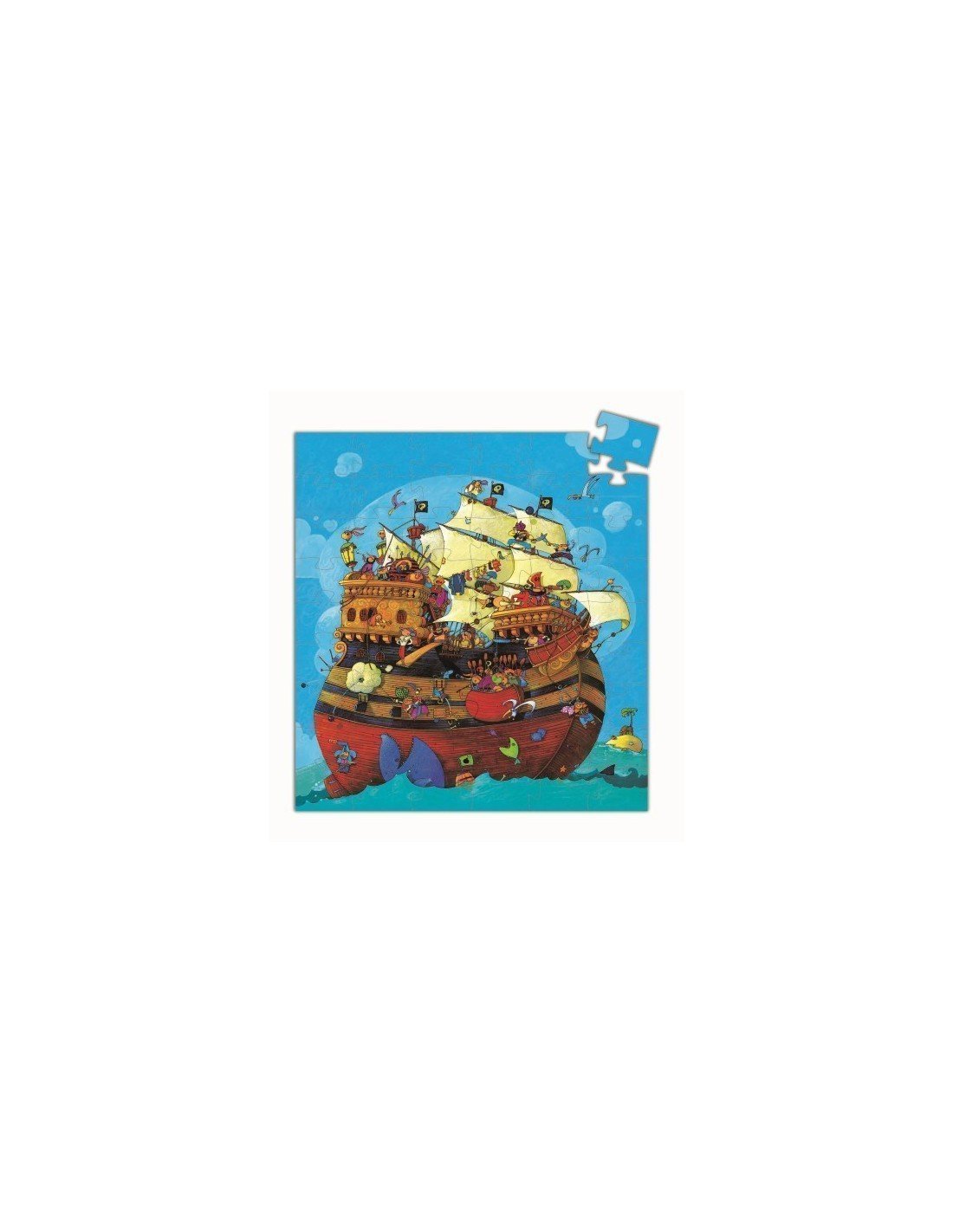 Contenido: 54 piezas de puzzle en forma de silueta con ilustraciones vibrantes de un barco pirata.