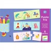 Tres puzzles en uno: variedad temática para mantener el interés y trabajar diferentes escenas de la vida cotidiana.