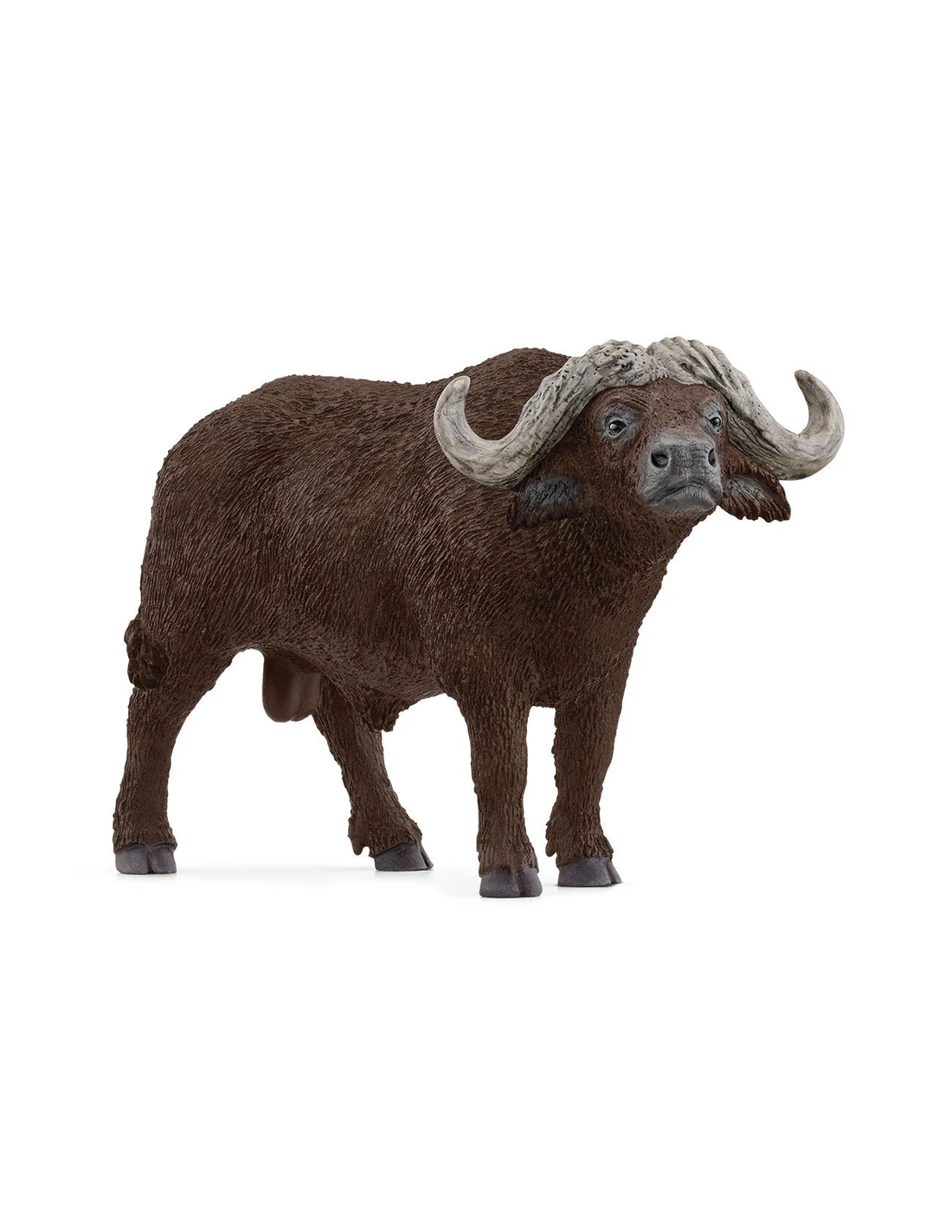 Es un animal imponente, negro como el carbón. Lo que más impresiona son sus enormes cuernos curvados sobre la frente. ¡Es mejor no pelearse con él! Aunque la mayor parte del tiempo es muy pacífico. Pasta tranquilamente y disfruta del día en la sabana africana.