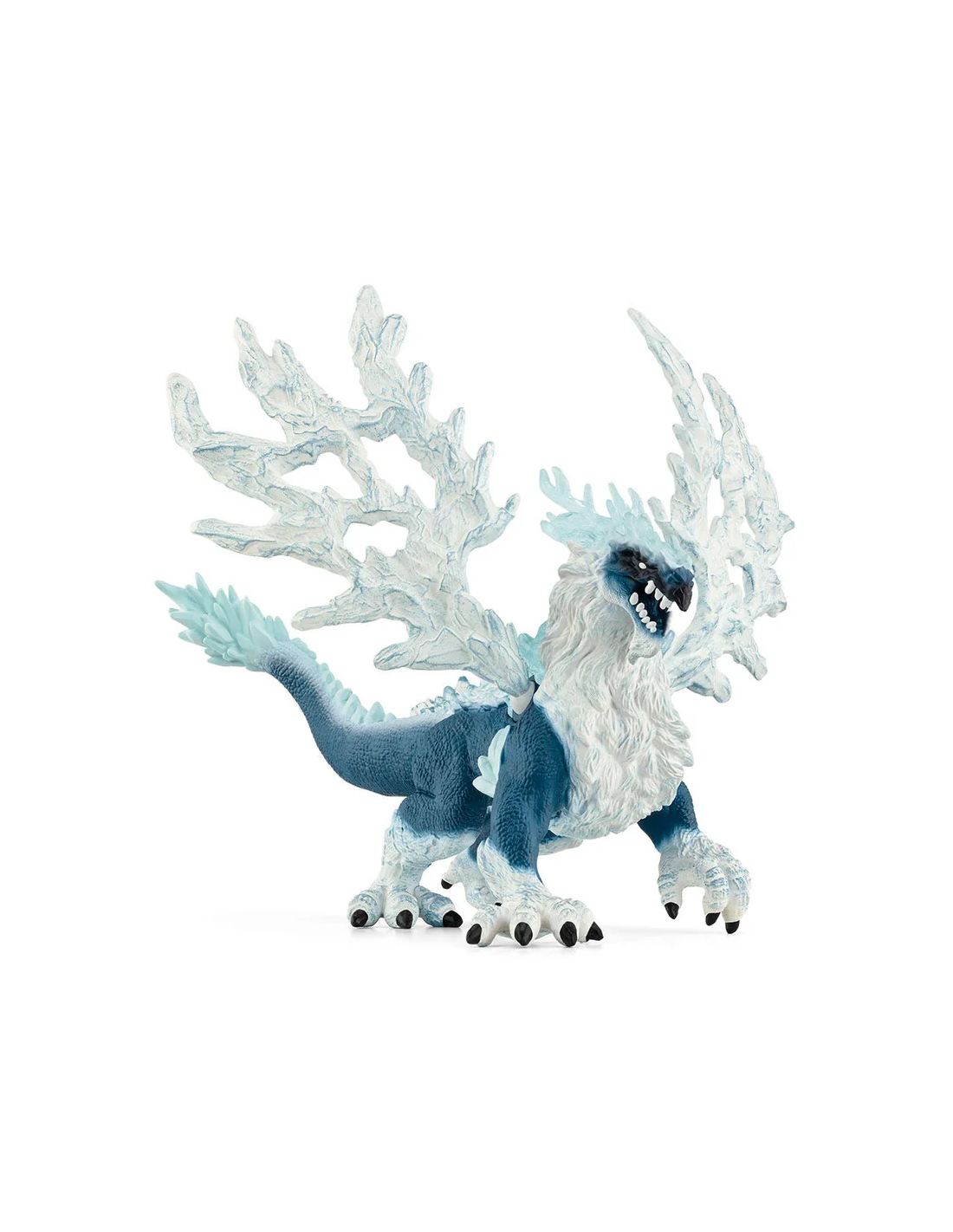 El Dragón de hielo vuela en círculos sobre ELDRADOR®. Ningún movimiento en tierra escapa a su mirada heladora. Descubre un peligro allí abajo y no lo duda: pega al cuerpo sus alas plateadas y se lanza en picado. El atacante en tierra no tiene ni idea de lo que le está pasando. El Dragón de hielo aparece frente a él como salido de la nada y agita su melena plateada. Abre el pico y muestra sus afilados dientes. Marca sus músculos amenazador y escarba profundos surcos en el suelo con sus garras. ¡Se dispone para el combate junto a sus compañeros de lucha, el Monstruo de hielo y el Lobo de nieve! (Figuras disponibles por separado)