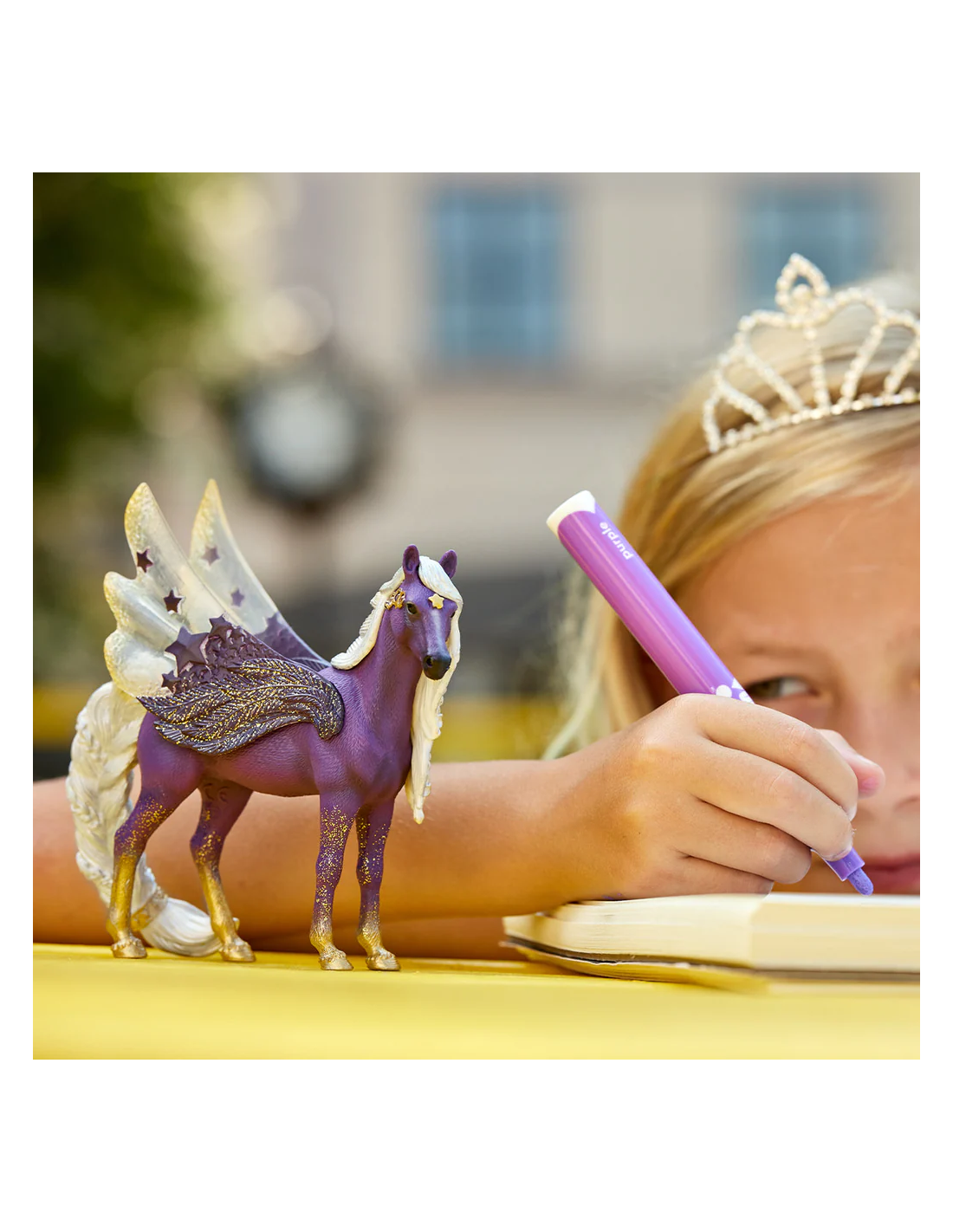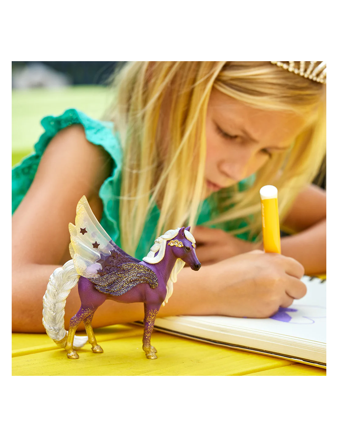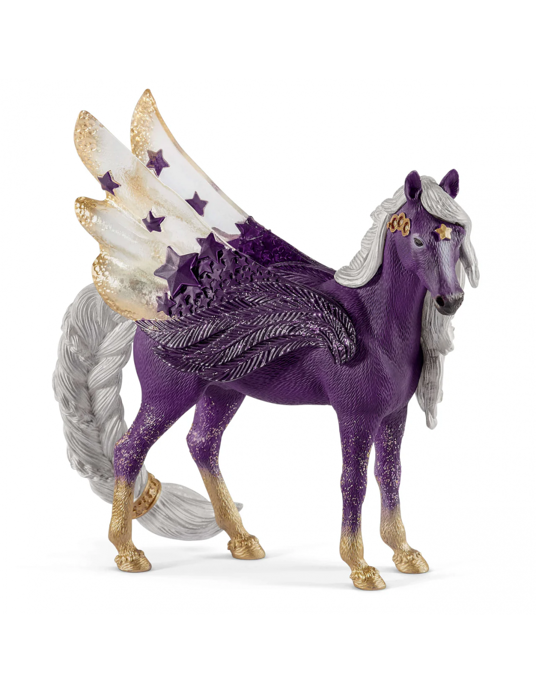 Esta preciosa yegua Pegaso de las estrellas no es de este mundo. Procede del espacio infinito del universo y eso se ve a primera vista. Guarda secretos que ni siquiera podríamos imaginarnos. Su aspecto exterior le da una apariencia especialmente mágica, y da la impresión de que acaba de descender de un cielo de noche estrellado. Ella y su familia, el imponente semental unicornio de la luna y su precioso potro unicornio estrella fugaz, forman una unidad mágica.