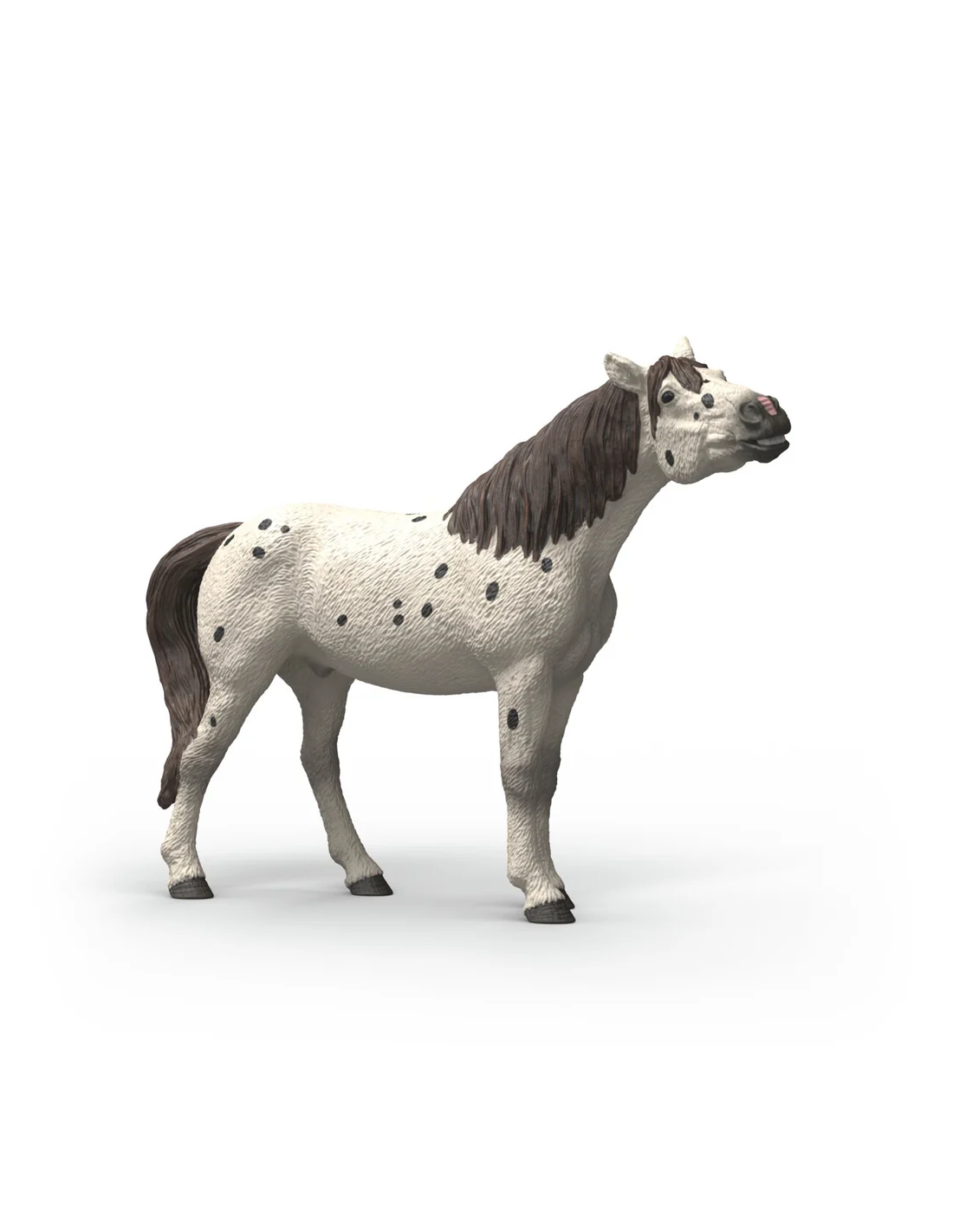 Este adorable caballo Knabstrupper tiene un pelaje blanco con manchas negras por todo el cuerpo. También tiene manchas oscuras en la cara, lo que le da un aspecto juguetón. Sobre todo cuando estira mucho la cabeza hacia delante y enseña sus poderosos dientes. ¿A quién crees que intenta impresionar?