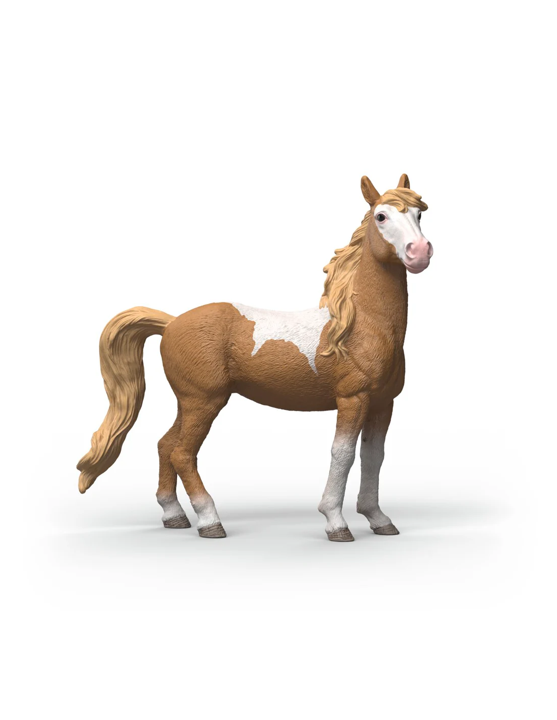La briosa yegua mustang no sólo tiene un aspecto maravilloso con su pelaje picazo blanco-marrón. También es muy curiosa. Ahora levanta las orejas con atención y sus ojos negros y suaves miran atentos a lo lejos. Debe haber oído algo. ¿Quizás el relincho del macho mustang? Clava sus pequeñas y maniobrables pezuñas en el suelo. Está lista para salir al galope en cualquier momento y lanzarse a la aventura.